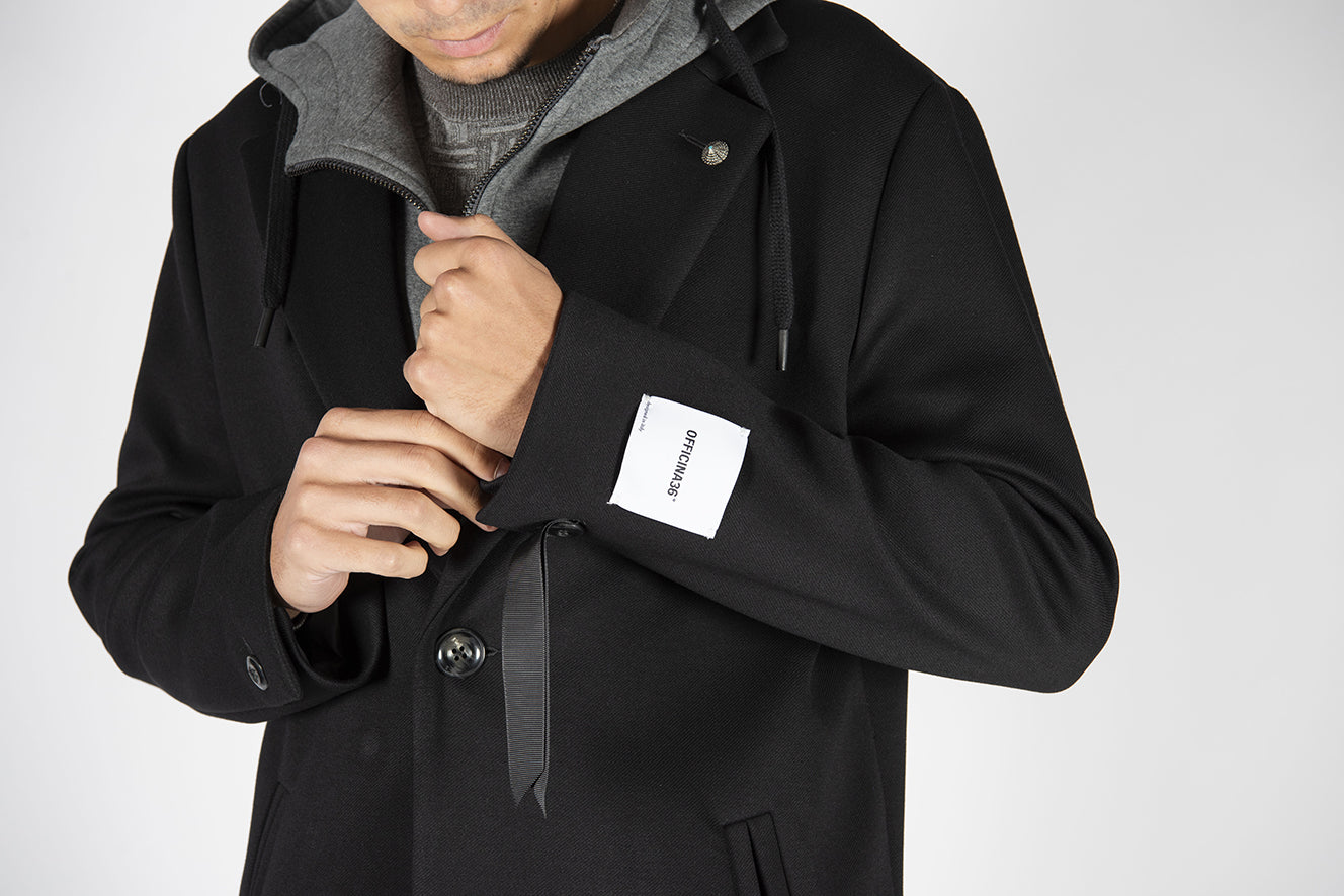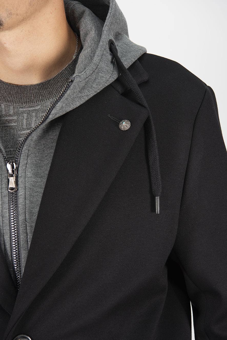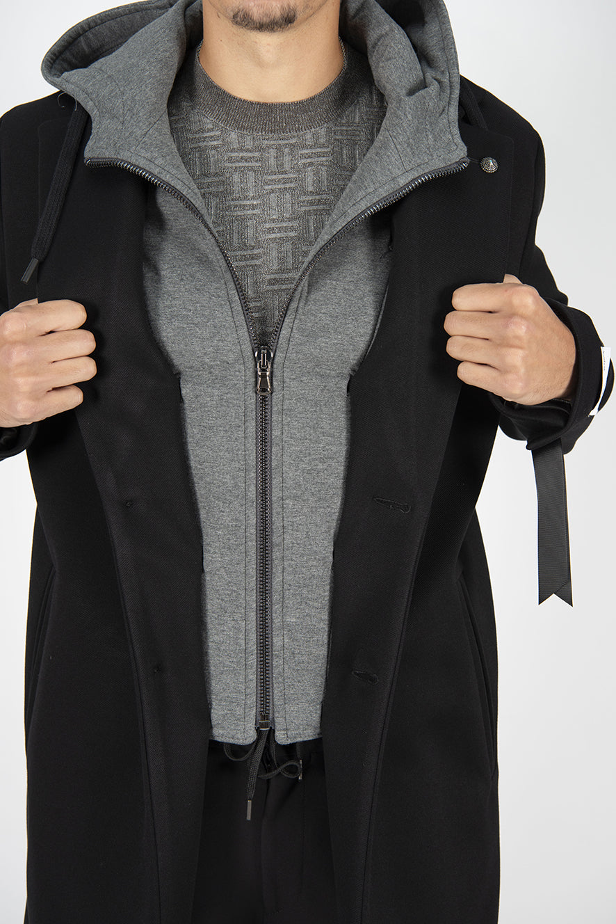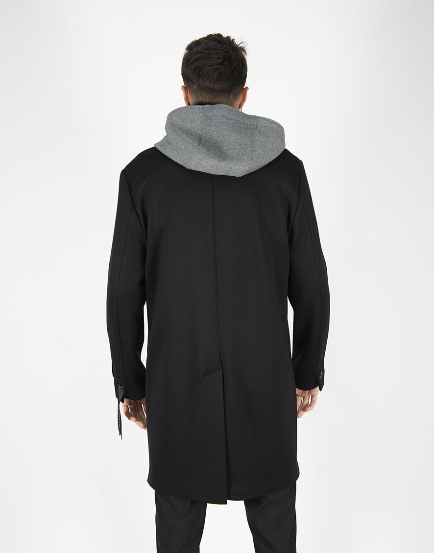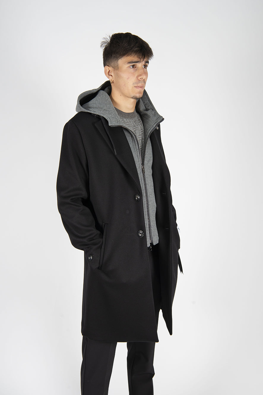 cappotto in viscosa nero,davantino con cappuccio staccabile in jersey grigio.