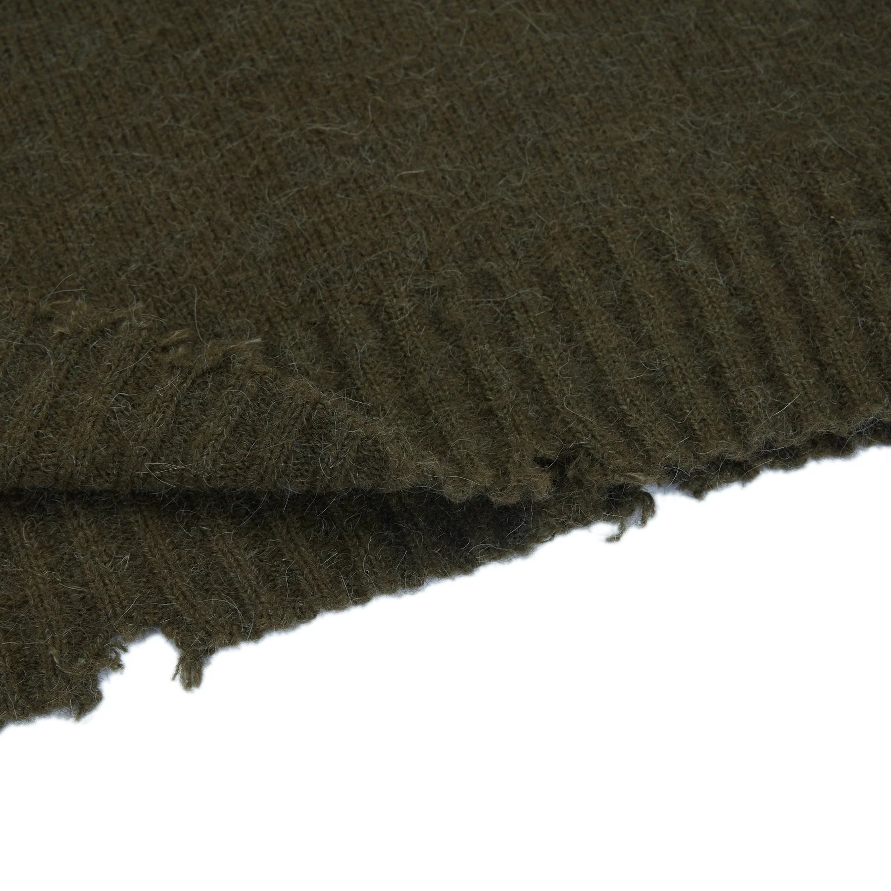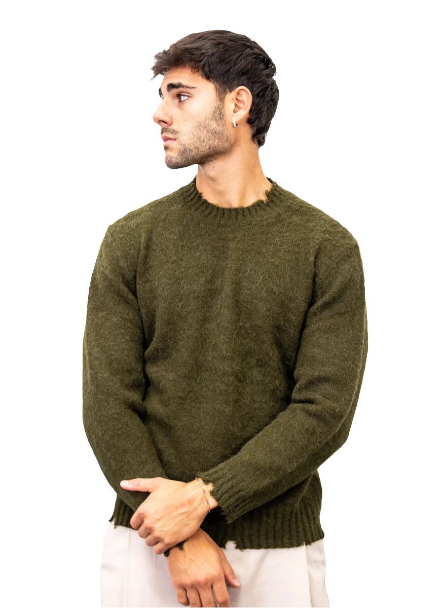 Girocollo in filato misto alpaca con superficie garzata e dettagli di rottura.