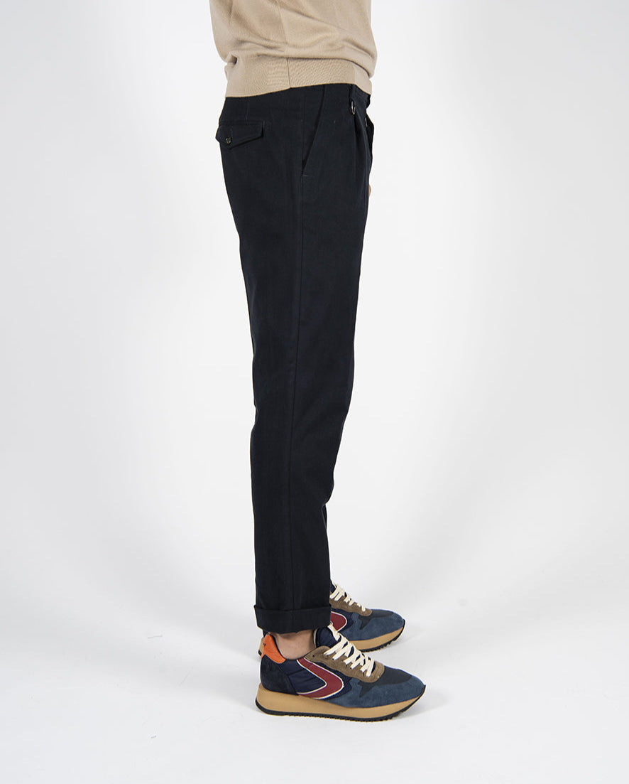 Pantalone chino modello Duomo in gabardina di lyocell con vestibilità regular, pinces frontali e tasche a pattina sul retro. Il design sartoriale con fondo risvoltato da 4 cm e passanti con anello metallico rinnova il classico con un dettaglio moderno e distintivo. Un capo versatile e raffinato, pensato per look eleganti con giacca e camicia o per outfit smart-casual con maglie e sneakers.