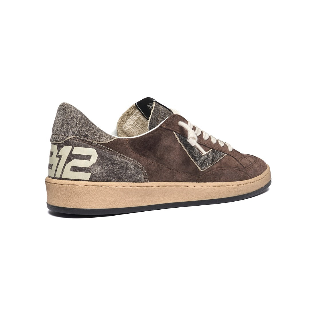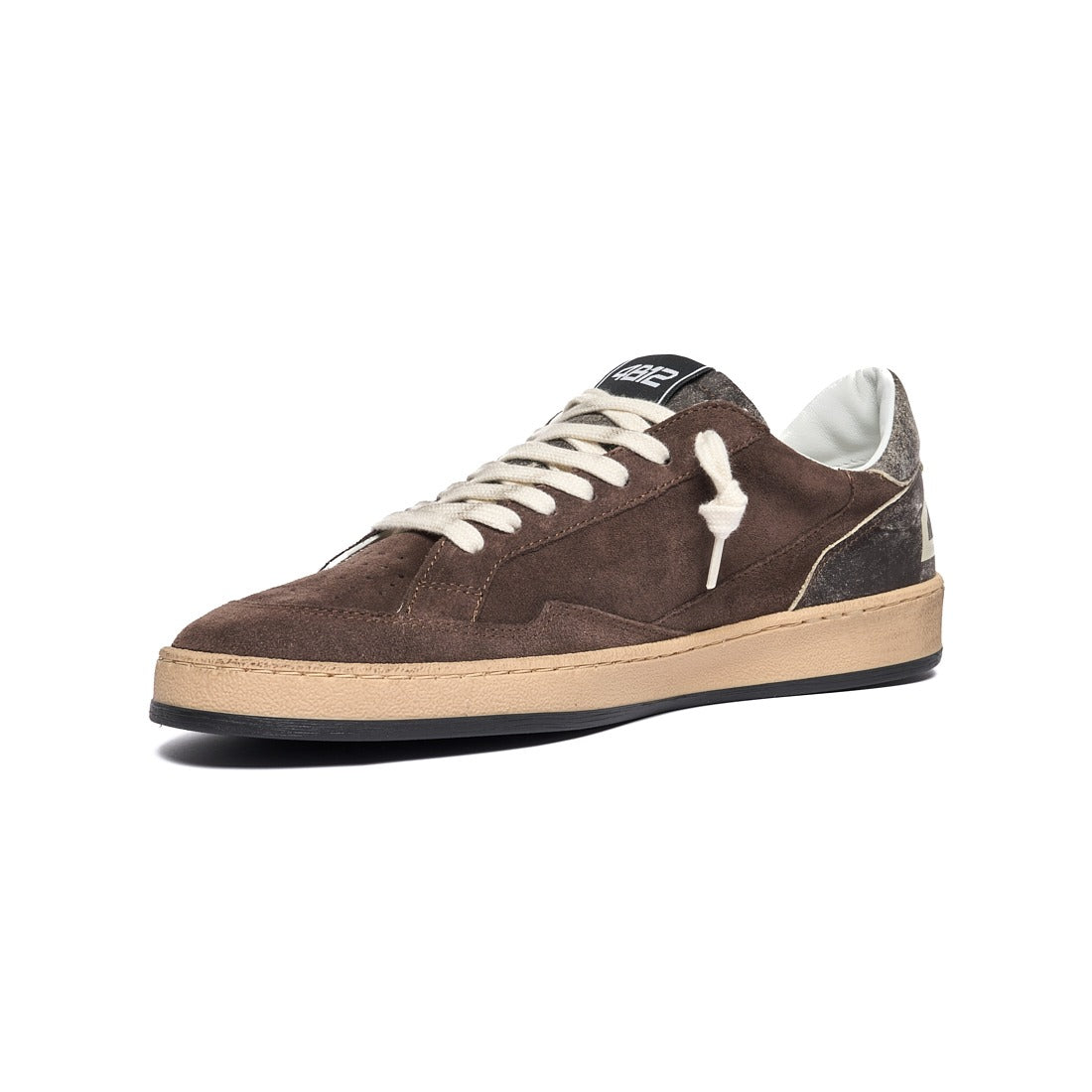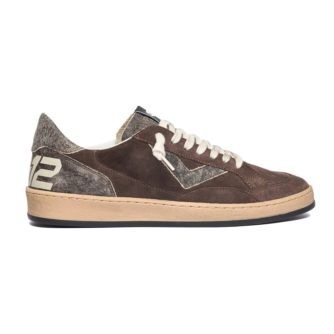 Sneakers Play di 4B12 realizzate interamente in camoscio di colore testa di moro, con dettagli in pelle di colore marrone scuro ad effetto anticato e logo impresso di colore avorio sul tallone. Lacci in cotone di colore avorio con effetto vintage. Soletta interna estraibile di 1,5 cm. Suola in gomma beige e nero con effetto invecchiato.