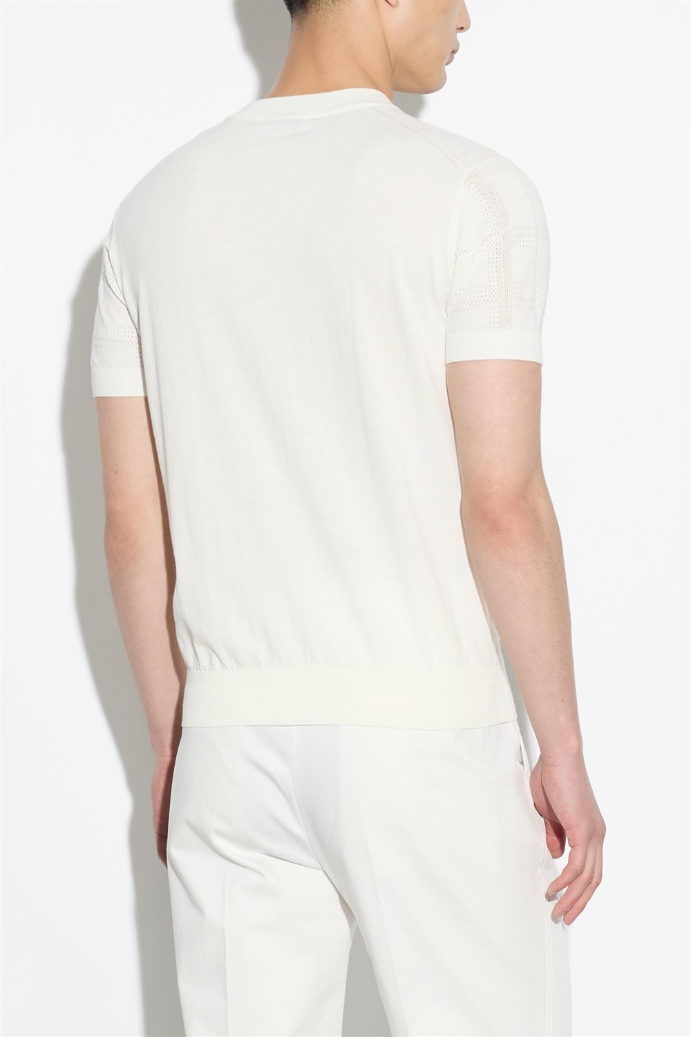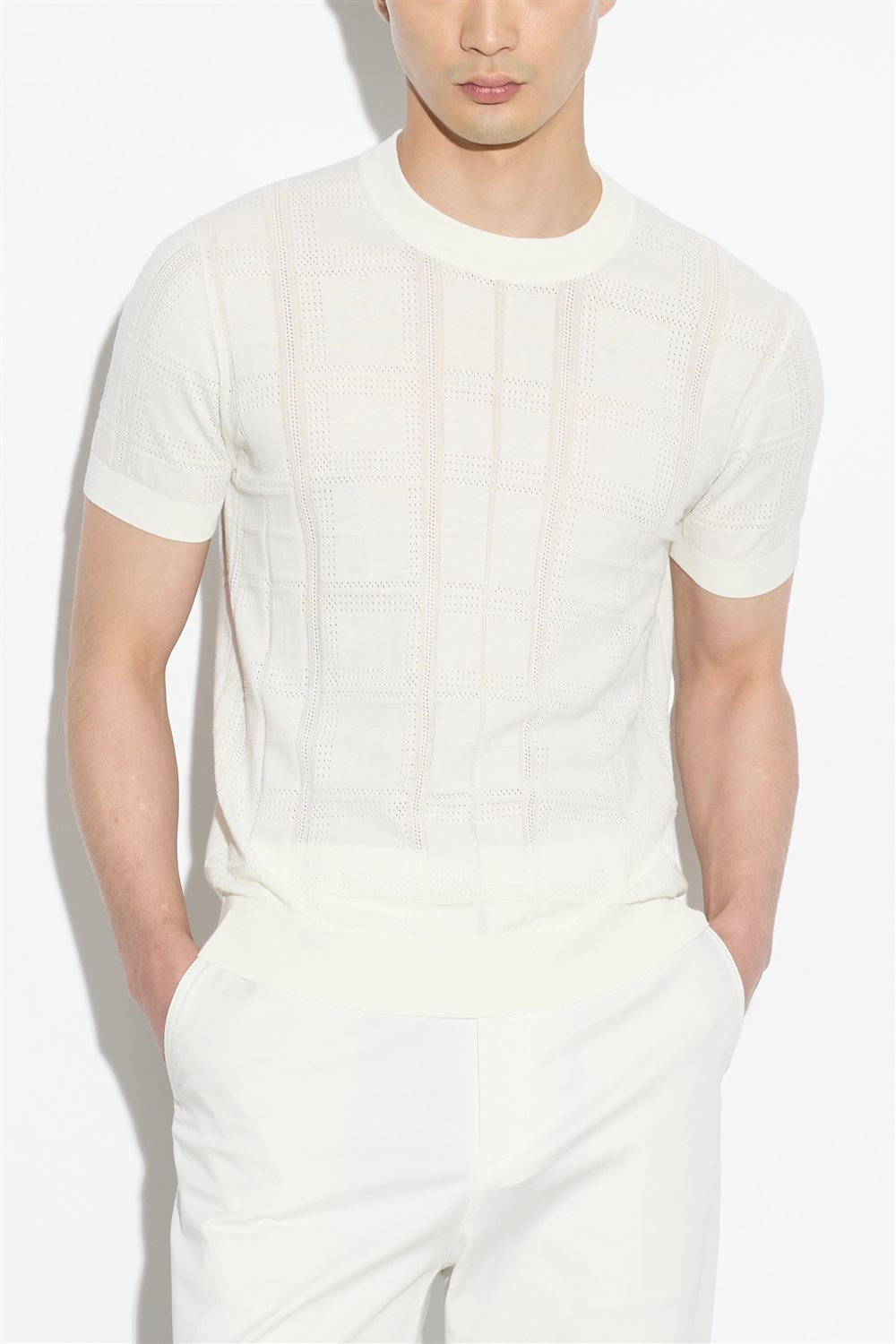 Maglia girocollo a maniche corte in cotone, caratterizzata da una lavorazione strutturata che crea un raffinato gioco di texture verticali. Il colore panna ne esalta la profondità materica e rende il capo ideale da indossare da solo o sotto una giacca leggera, per un look curato ma disinvolto.