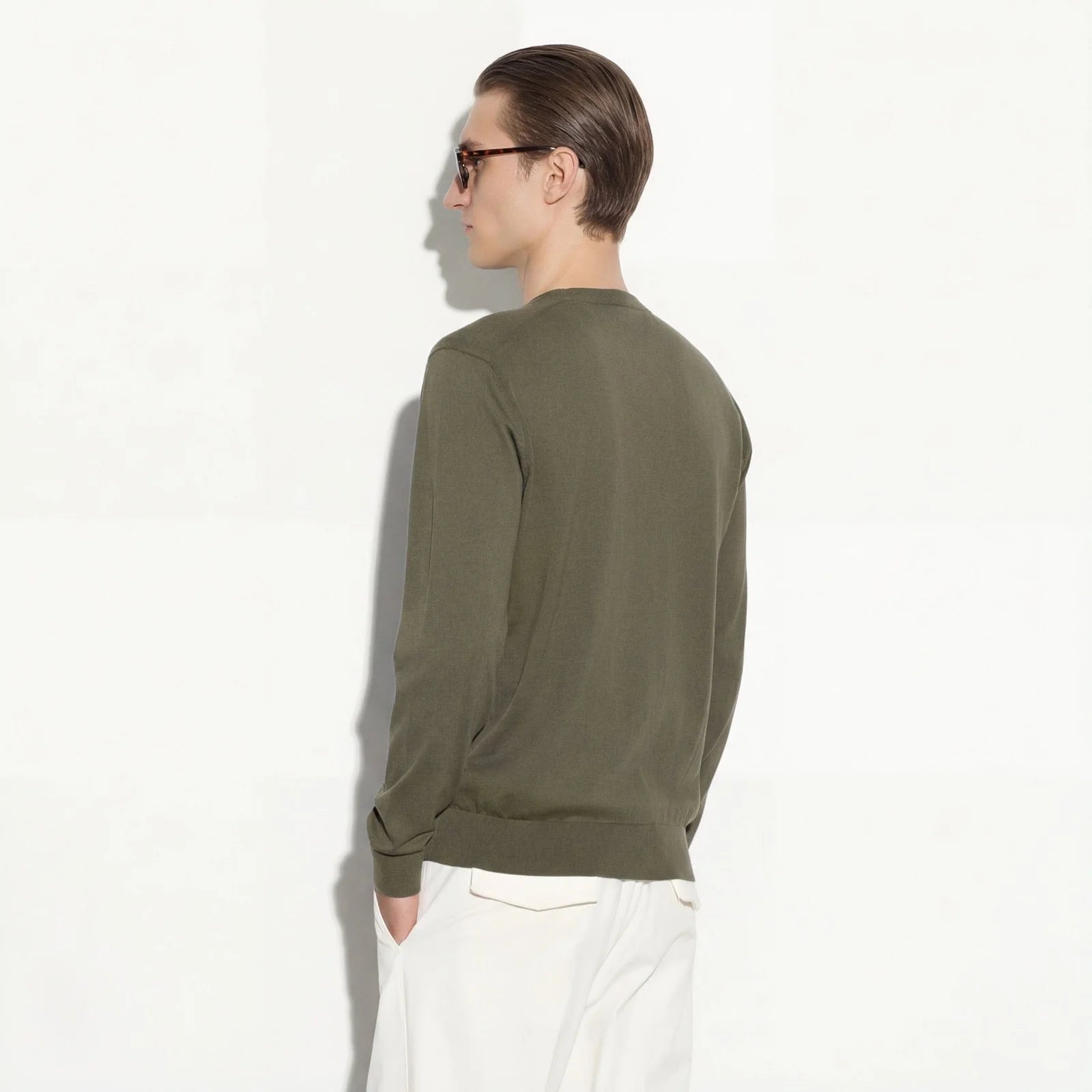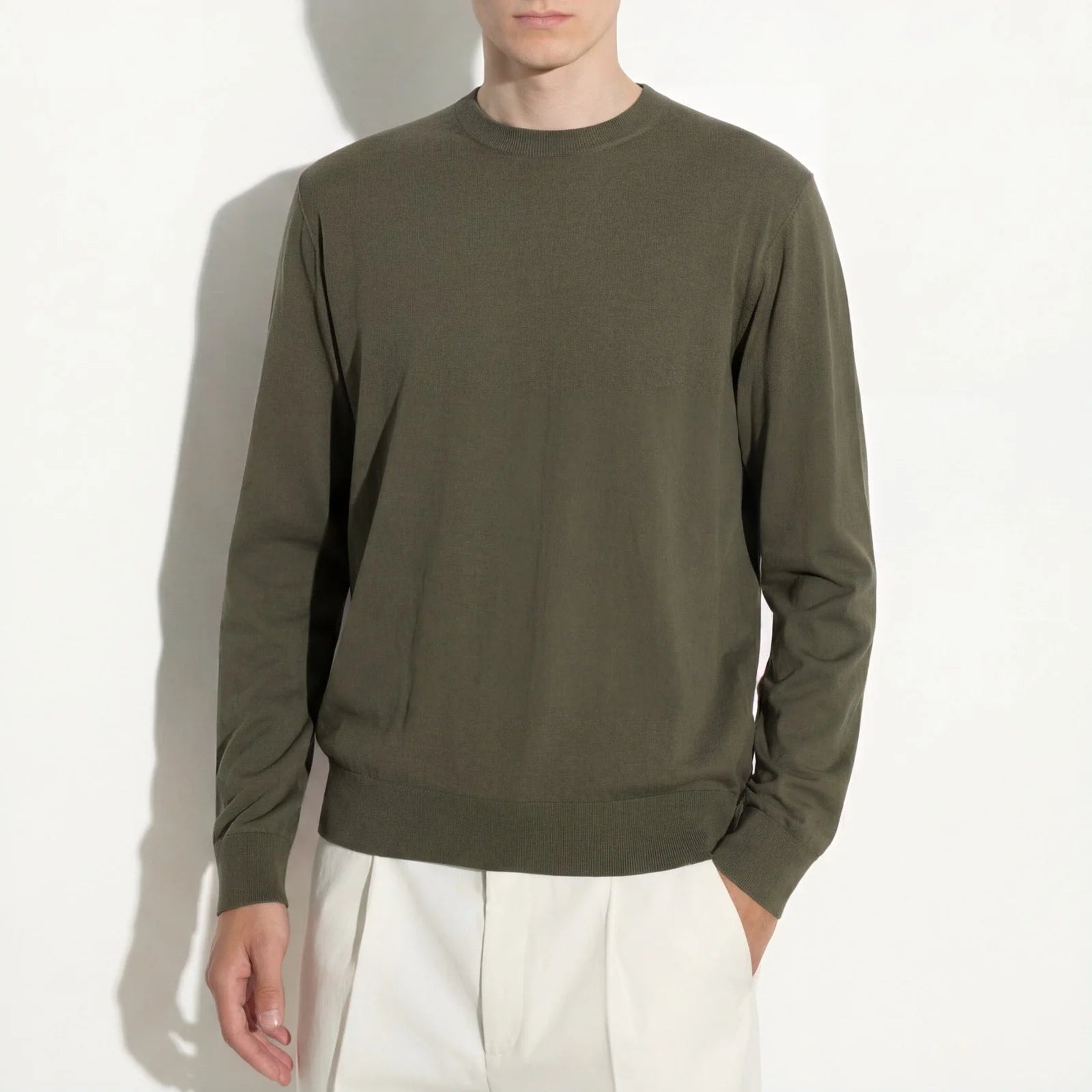Maglia girocollo in cotone rasato dalla vestibilità regular, proposta in una tonalità profonda che attraversa le stagioni con naturalezza. La costruzione equilibrata e le finiture a costina su collo, fondo e polsi definiscono il capo con misura, rendendolo adatto sia a look più curati sia a interpretazioni quotidiane. Un modello pensato per diventare un riferimento stabile nel guardaroba maschile.