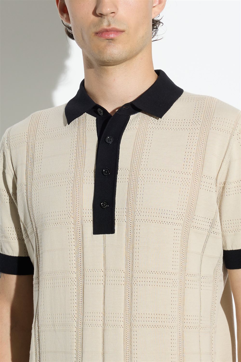 Polo a maniche corte in cotone lavorato, definita da un motivo a quadri che dona profondità alla superficie mantenendo un’estetica essenziale. Un capo pensato per uno stile estivo curato, facile da inserire nel guardaroba quotidiano.