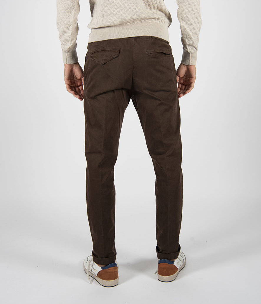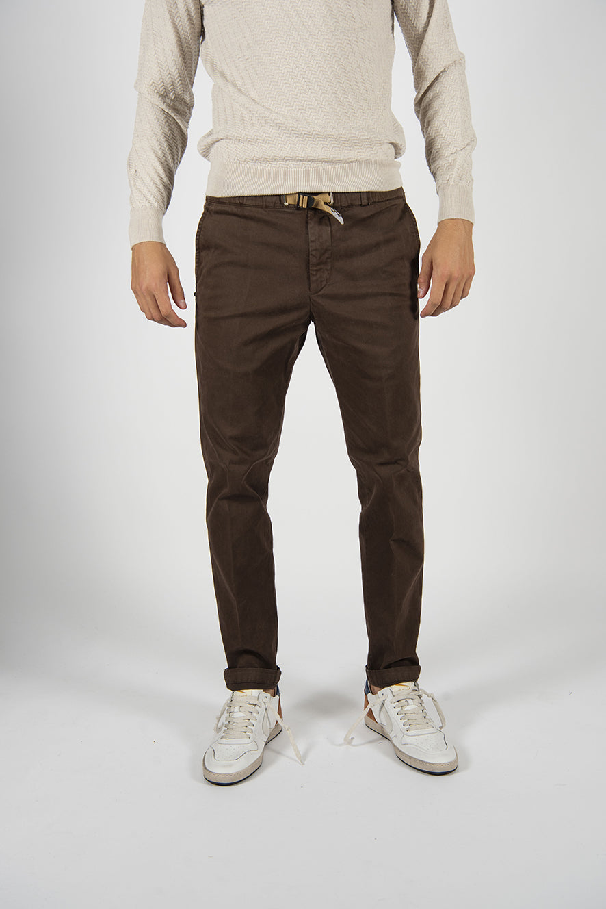 Pantaloni in cotone gabardina con vita elasticizzata, cintura in grosgrain regolabile con fibbia sul davanti, tasche laterali e tasche sul retro.