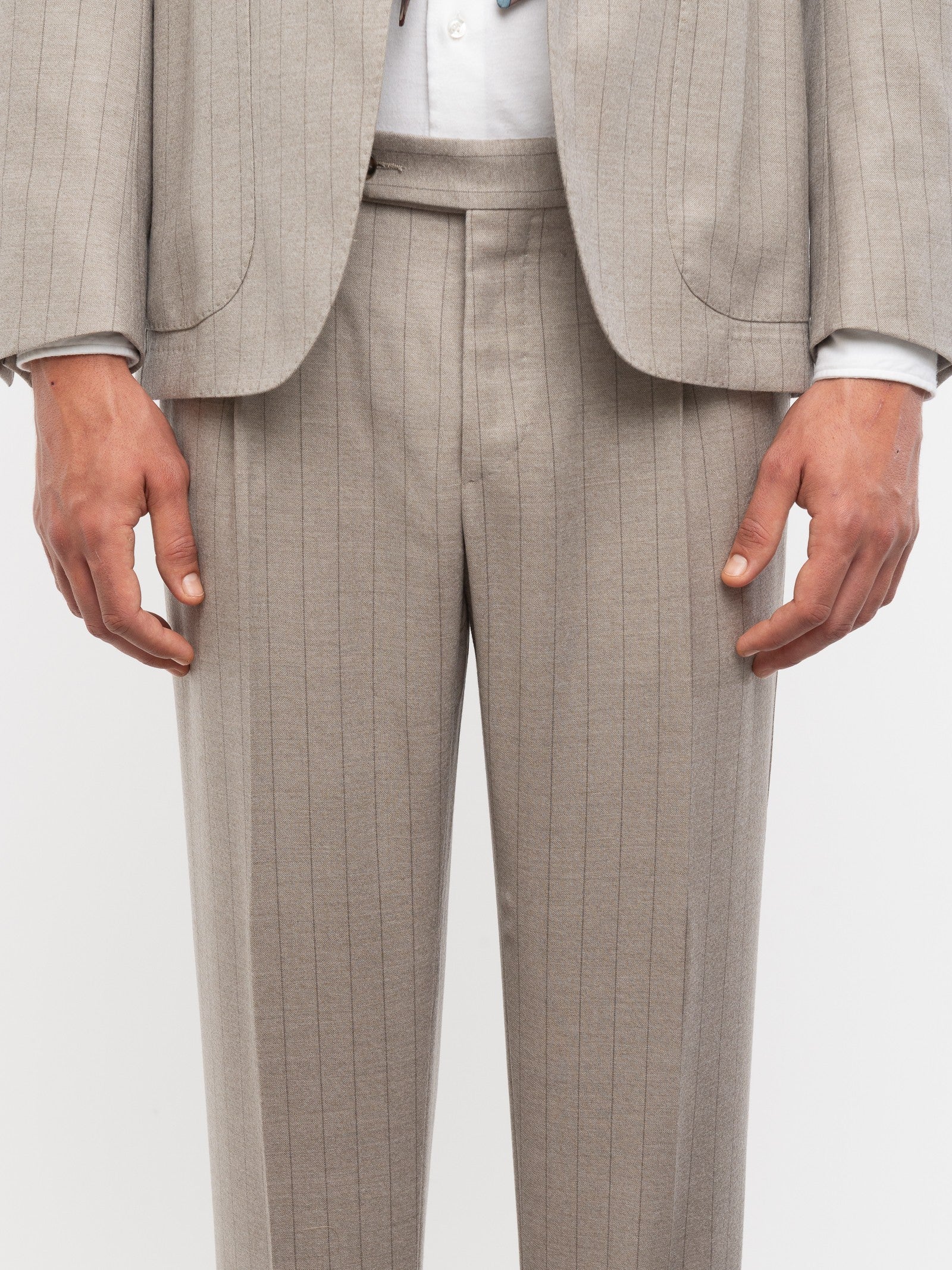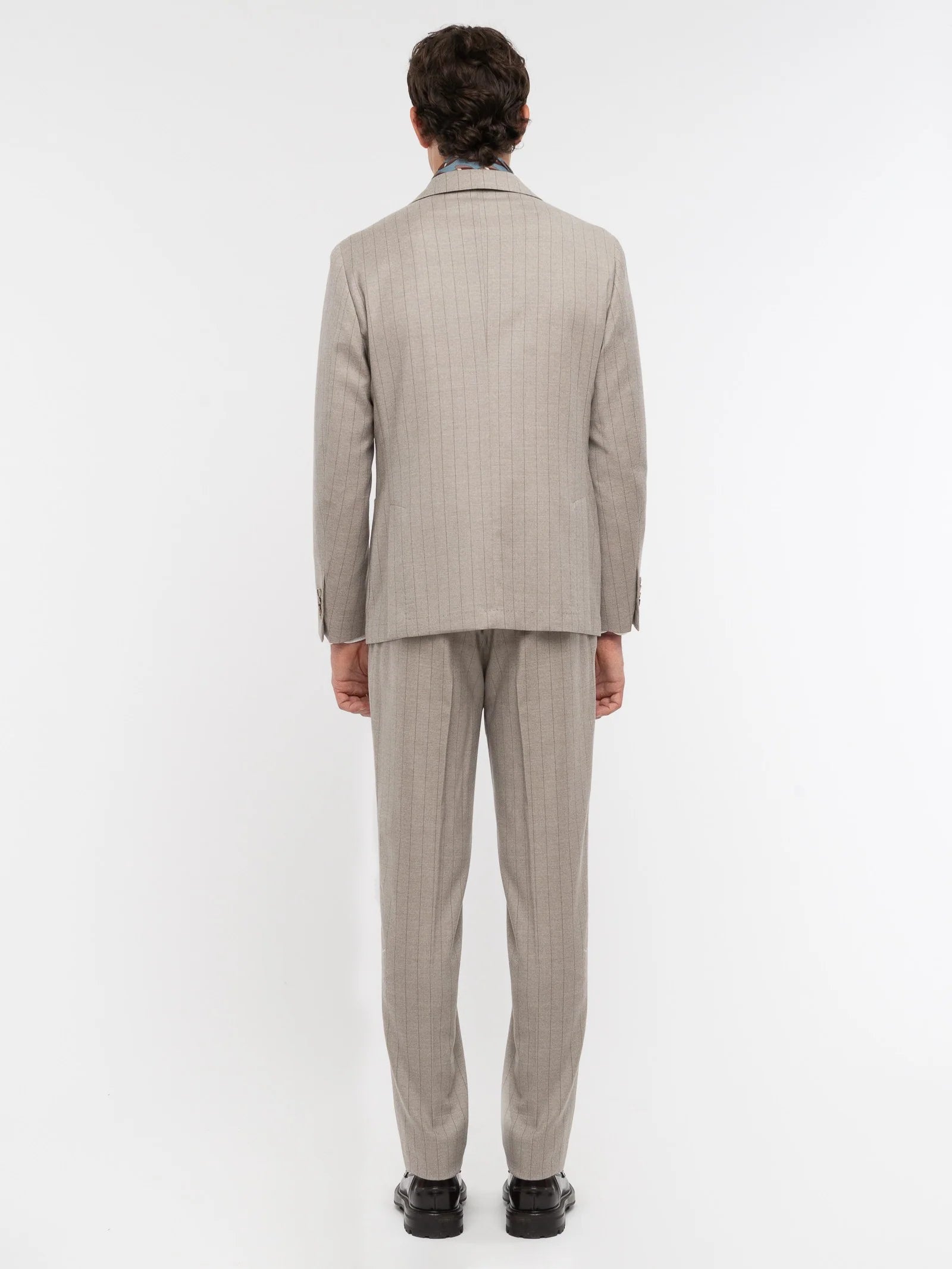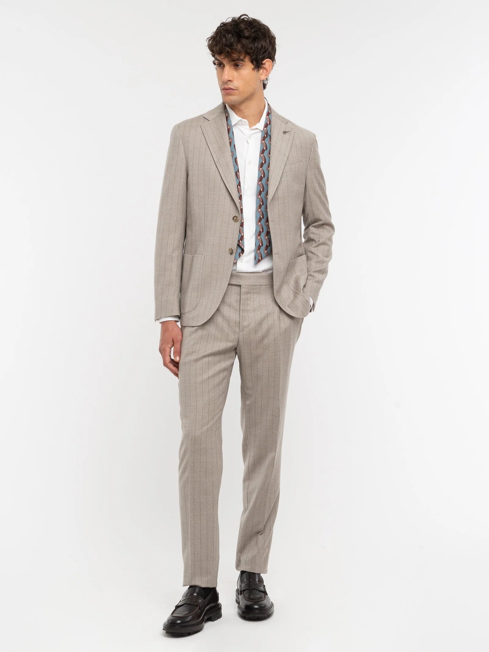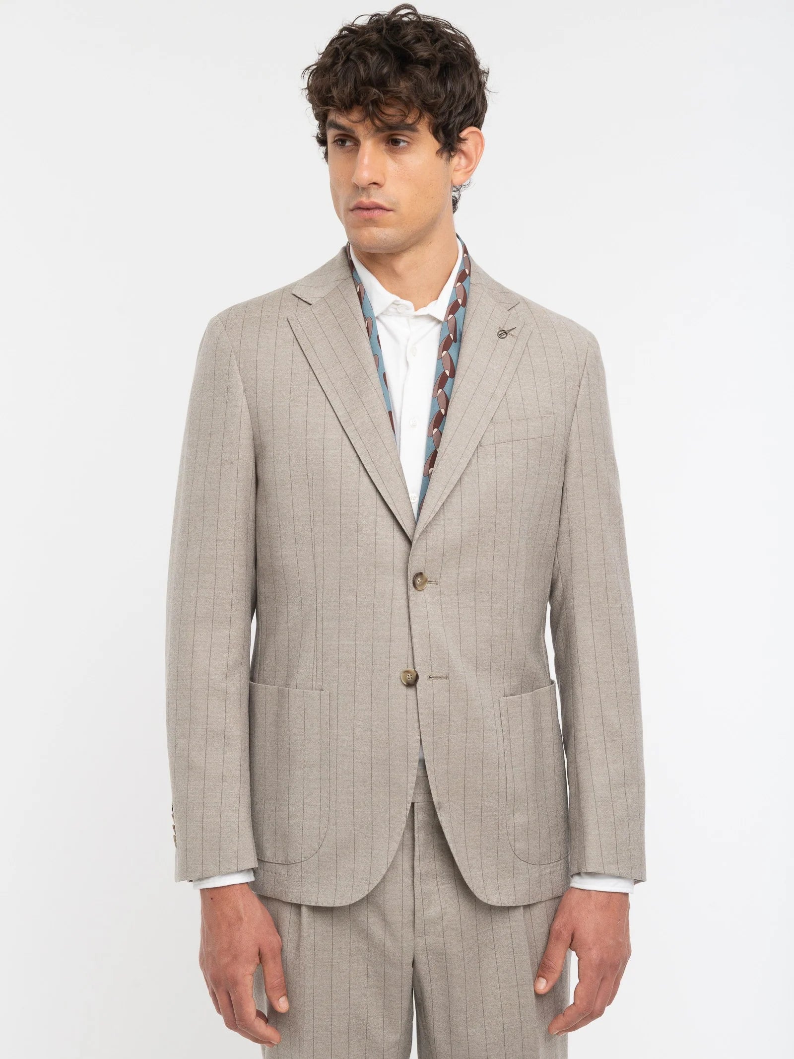 Abito sfoderato drop 7. Giacca: chiusura due bottoni, due tasche a toppa e un taschino frontali, spacchi laterali sul retro, tre bottoni ai polsi, finiture con impunture. Pantalone: una pinces, due tasche america e due a filo con bottone sul retro, passanti in vita, chiusura con zip e bottone, fondo 17,5 cm. Gessato di lana stretch