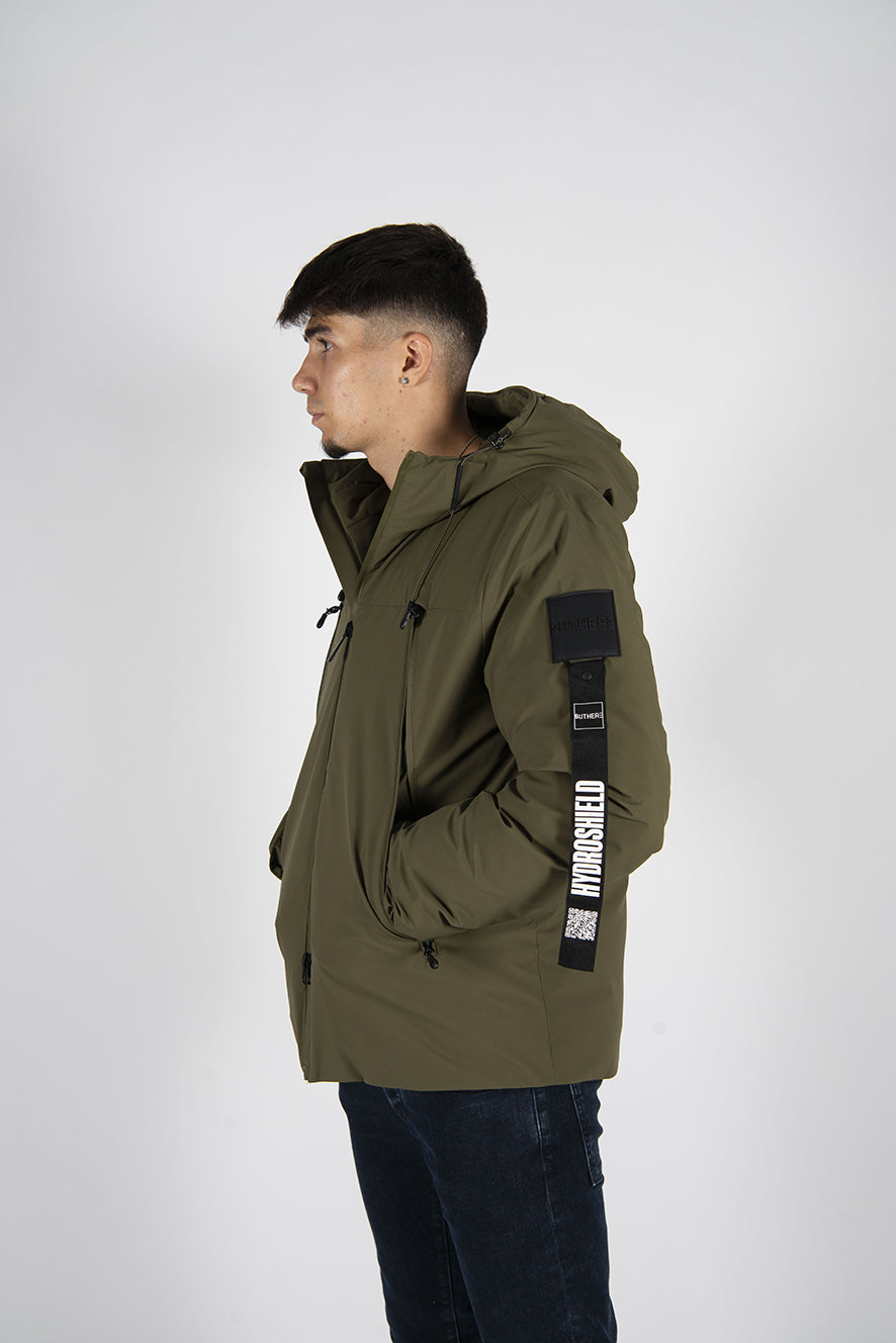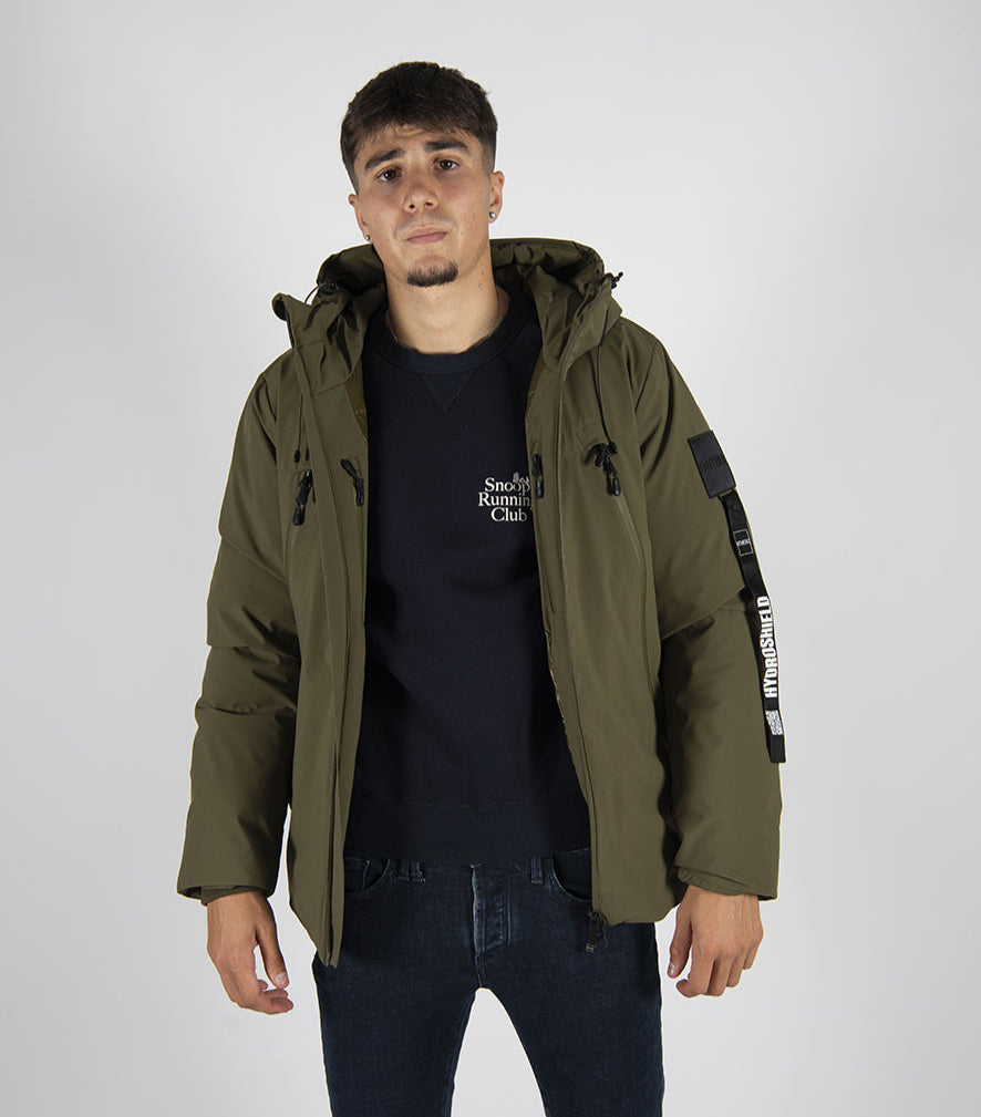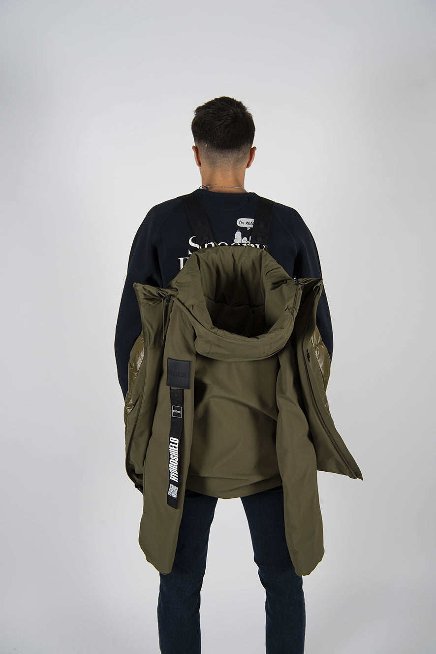Piumino da uomo dal tessuto compatto e luminoso con una trama strutturata e rinforzata che consente un' ampia resistenza agli strappi, RIP STOP. Al capo è stato poi aggiunto uno strato di rivestimento finale, rafforzato da una finitura antigoccia che impedisce la penetrazione di acqua e vento. Zip termosaldate, patch del logo sul braccio sinistro. Il capo ha in dotazione anche due bretelle per metterlo a zaino quando si è in luoghi chiusi.