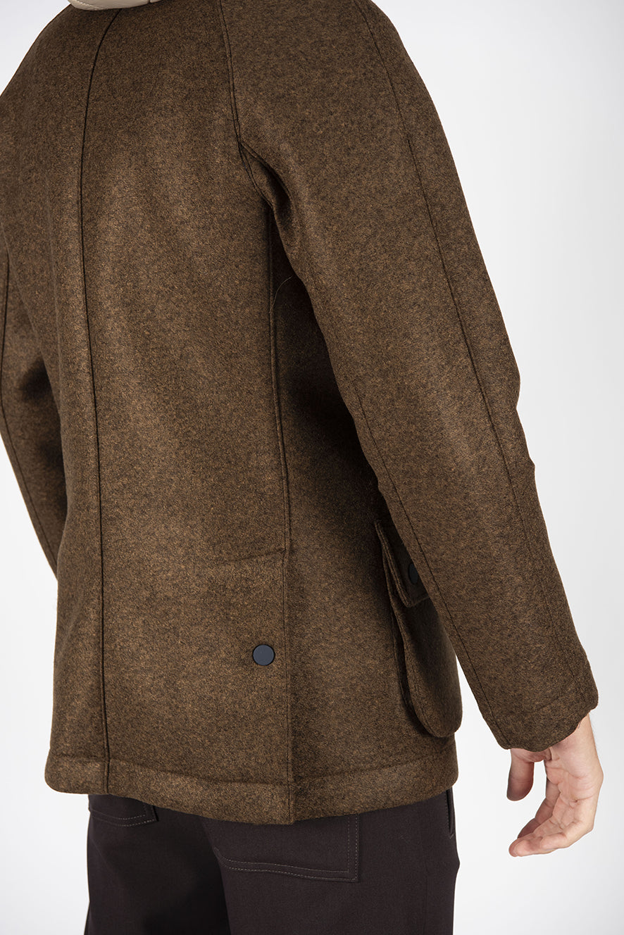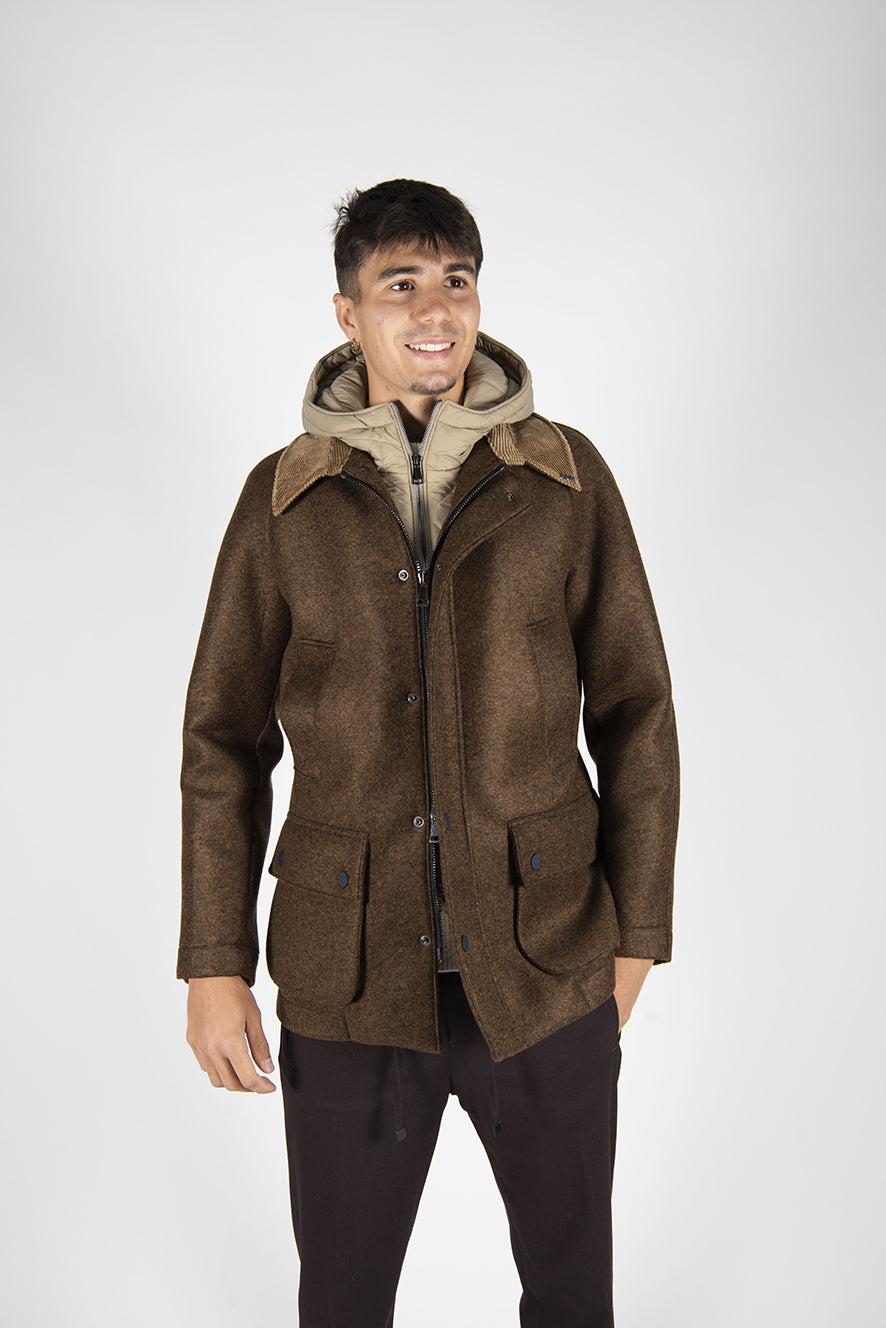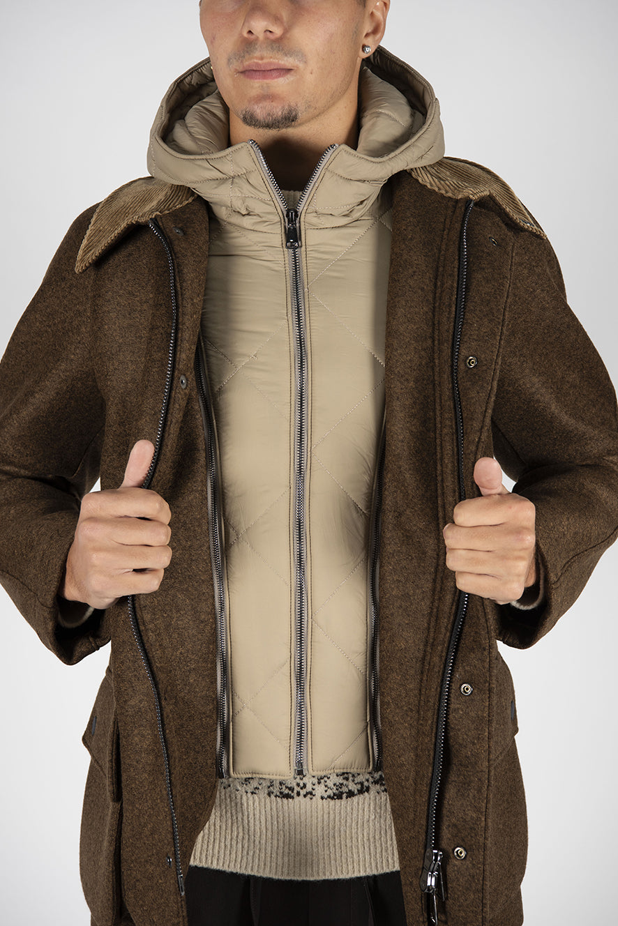 esterno lana interno neoprene,con davantino trapuntato staccabile.