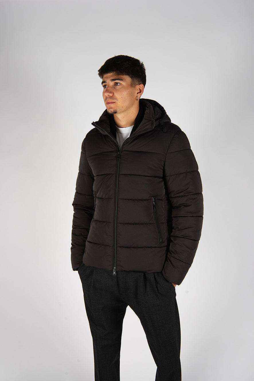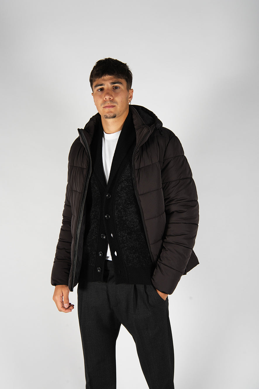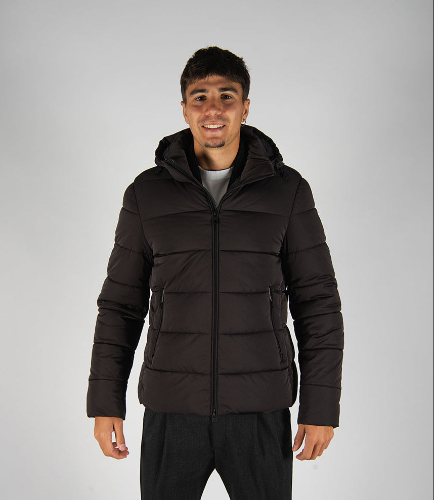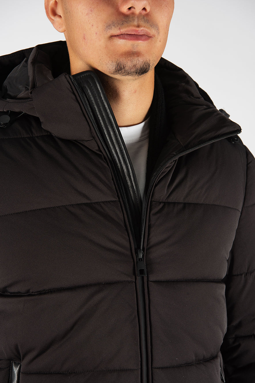 piumino trapuntato con cappuccio, interno in ovatta, contrasti in pelle, chiusura doppia zip , due tasche laterali con zip. Nylon tecnico bi-stretch