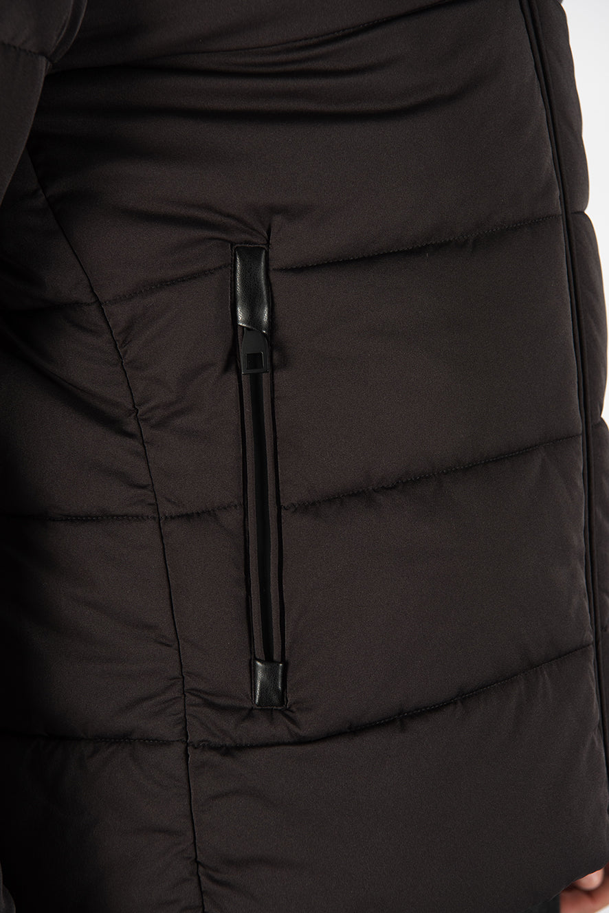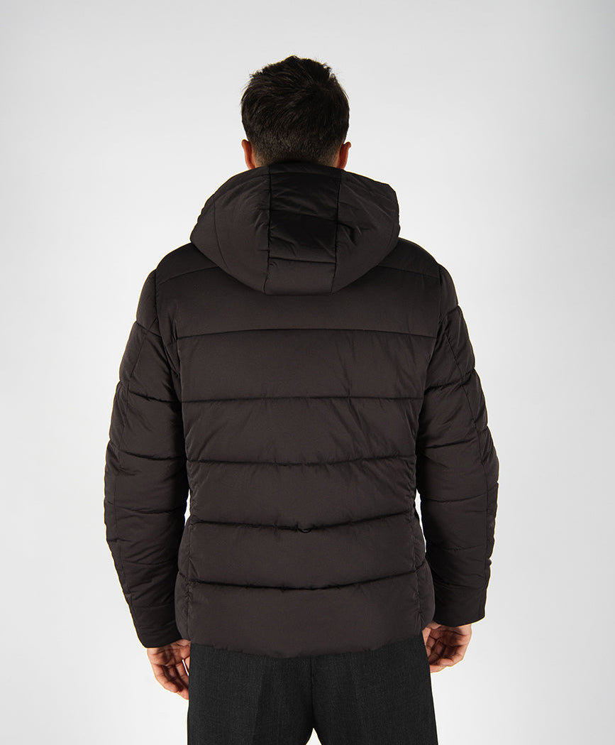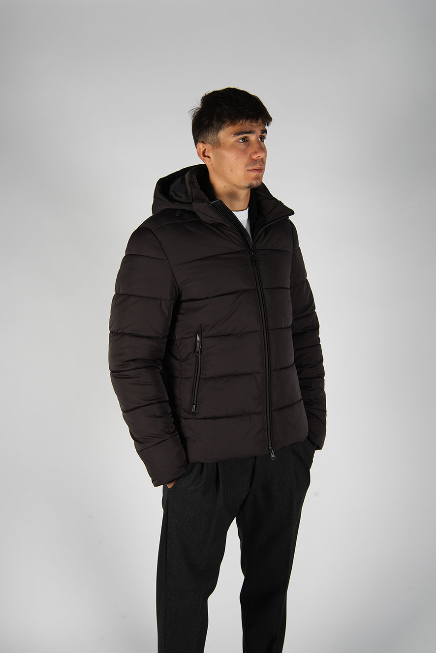 piumino trapuntato con cappuccio, interno in ovatta, contrasti in pelle, chiusura doppia zip , due tasche laterali con zip. Nylon tecnico bi-stretch