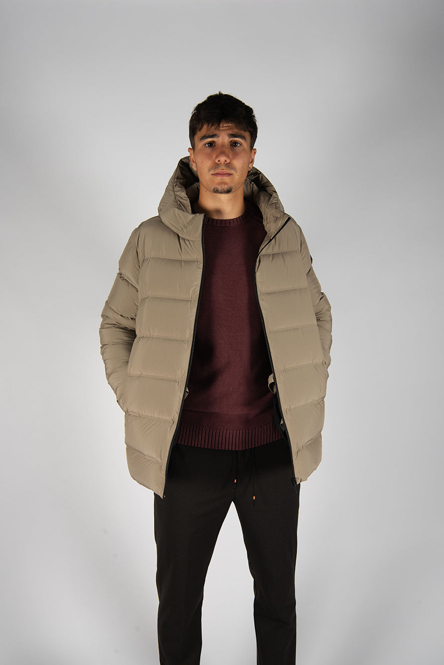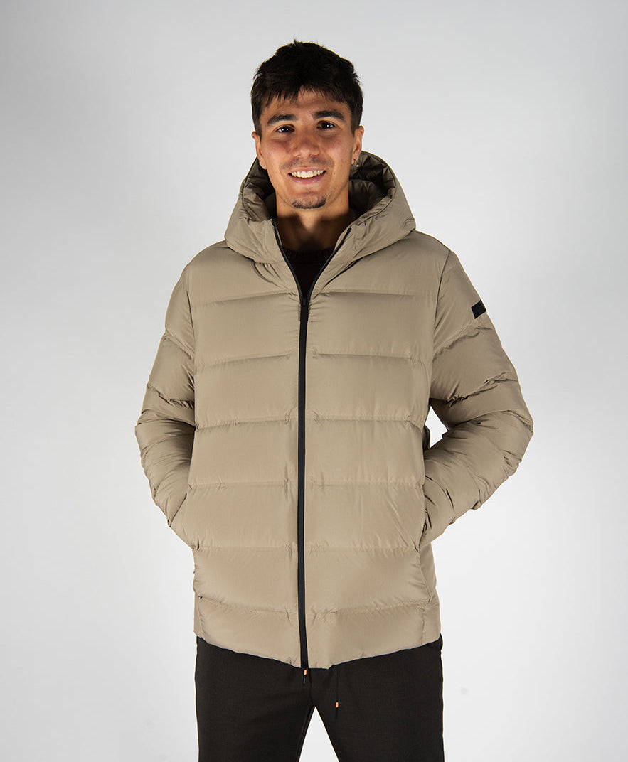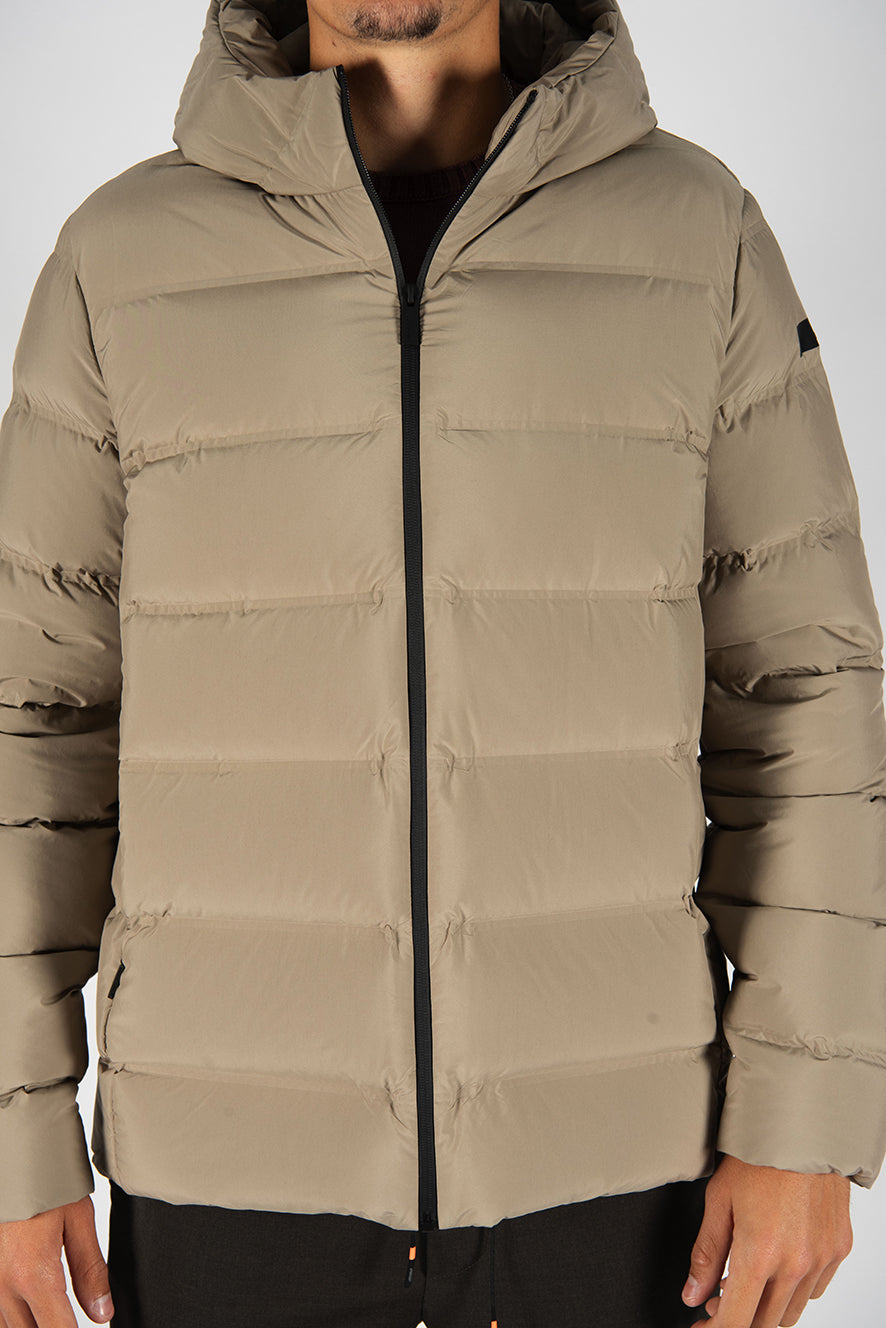 Il piumino di lunghezza media e dal fit regolare è caratterizzato dalla texture senza soluzione di continuità dei canali tubici dal touch morbido e consistente, che contengono l'imbottitura in piuma d'anatra 90/10. La costruzione ad alta densità è rinforzata dalle nastrature interne. Sul davanti, la zip spirale spalmata nera solca il pattern orizzontale del tubico da 10 cm, fino ad assicurare il collo alto e protettivo e il cappuccio avvolgente fisso. Le tasche laterali sono provviste di zip invisibile, mentre l'interno è dotato di un taschino con zip invisibile, impreziosito dal doppio filetto arancione e dalla tag a cuore "Made with love, designed in Tuscany". Il logo a microiniezione nero sulla manica sinistra firma un capospalla perfetto per tutti coloro che cercano calore e leggerezza in ogni situazione.