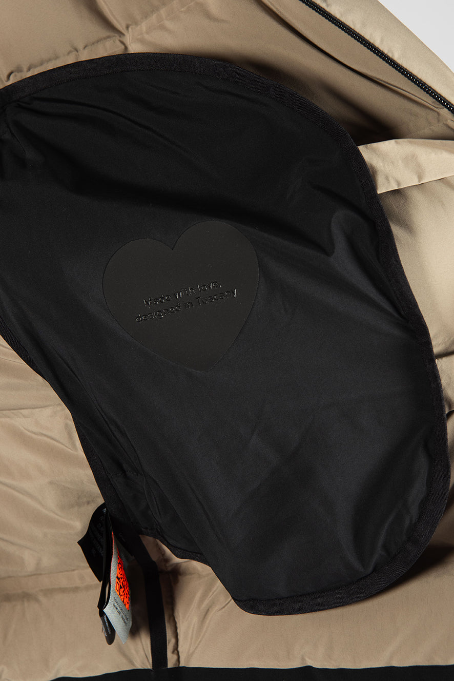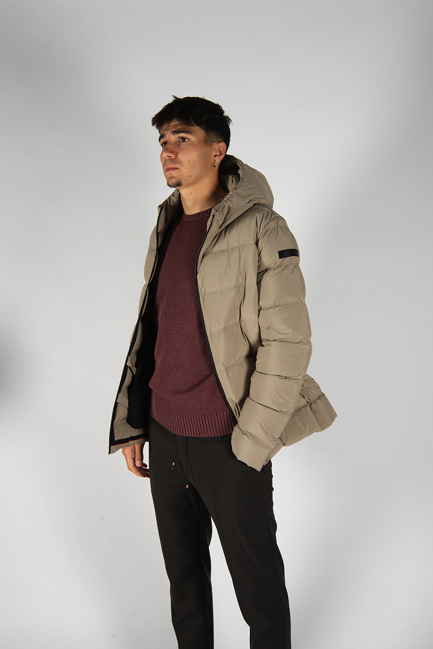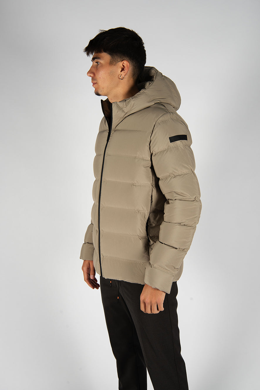 Il piumino di lunghezza media e dal fit regolare è caratterizzato dalla texture senza soluzione di continuità dei canali tubici dal touch morbido e consistente, che contengono l'imbottitura in piuma d'anatra 90/10. La costruzione ad alta densità è rinforzata dalle nastrature interne. Sul davanti, la zip spirale spalmata nera solca il pattern orizzontale del tubico da 10 cm, fino ad assicurare il collo alto e protettivo e il cappuccio avvolgente fisso. Le tasche laterali sono provviste di zip invisibile, mentre l'interno è dotato di un taschino con zip invisibile, impreziosito dal doppio filetto arancione e dalla tag a cuore "Made with love, designed in Tuscany". Il logo a microiniezione nero sulla manica sinistra firma un capospalla perfetto per tutti coloro che cercano calore e leggerezza in ogni situazione.